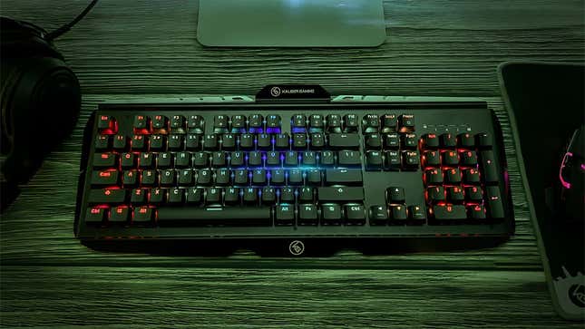 The underside of the $90 HVER Pro X is the black plastic rectangle of a keyboard base. The thin, shaped, brushed aluminum plate that’s characteristic of most Kaliber Gaming keyboards is screwed on top. The switches, custom optical-mechanical dealios designed with a pleasing tactical bump similar to Cherry MX Browns, are inserted through the metal plate and soldered in place. It’s like a basic plastic keyboard wearing metal armor. It’s sturdy with little flex. If you dropped it on your bare foot, there’s a good chance it would leave a large gash.